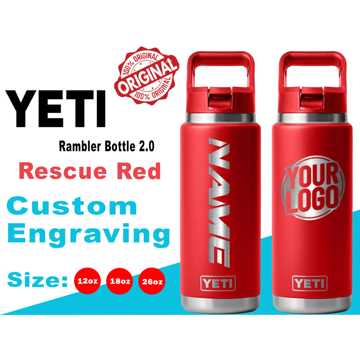 YETI Rescue Red Rambler Bottle 2.0: Laser Engraved Personalized Bottle, Custom logo and Name Bottle, Christmas Gift, Personalized Gift